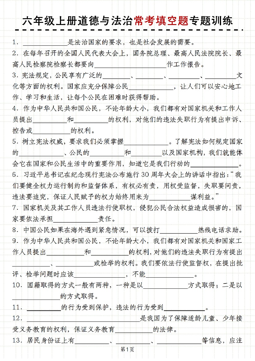 六年级上册道德与法治常考填空题专题训练