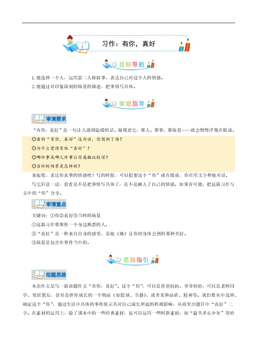人教部编版六年级语文上册第8单元同步作文:有你,真好-写作指导+范文赏析+病文升格-部编版语文六年级上册