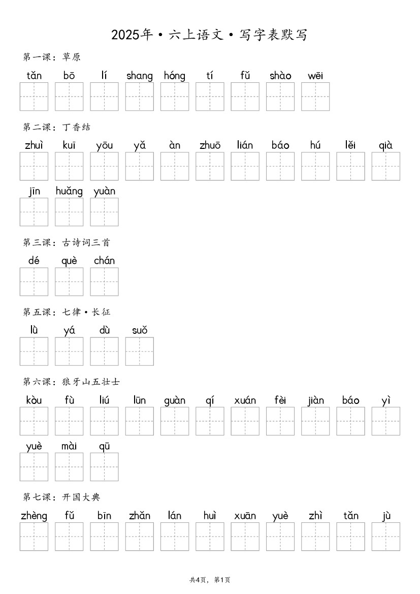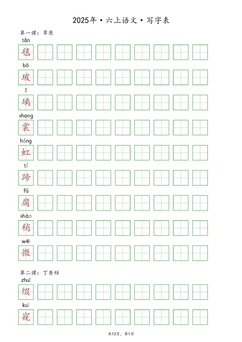 2025年6年级上册语文【抄写-写字表】(13页)