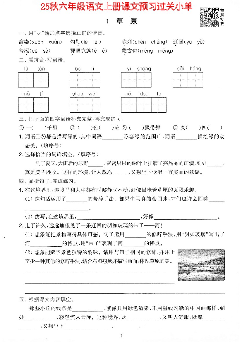 六年级语文上册课文预习过关单