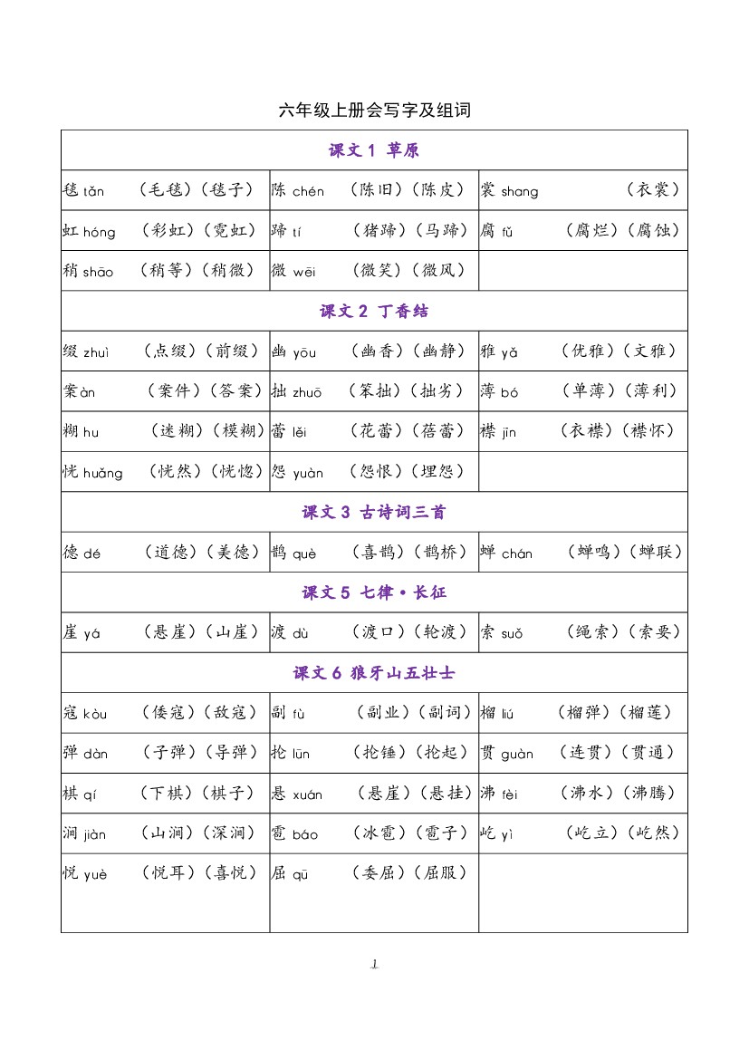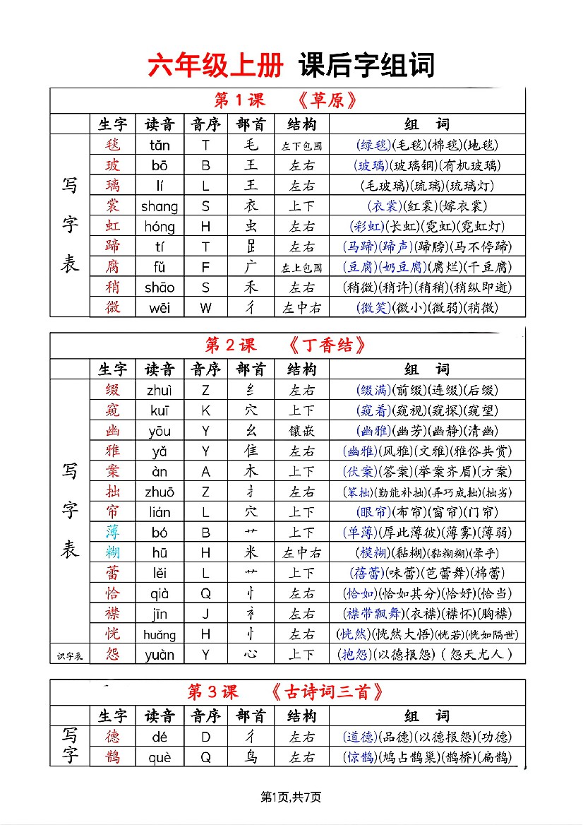 六年级上册课后生字组词