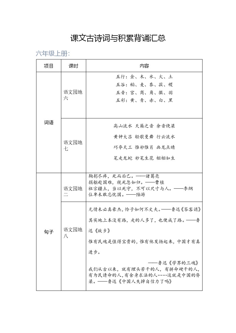 小学语文六年级上册古诗词和积累背诵汇总