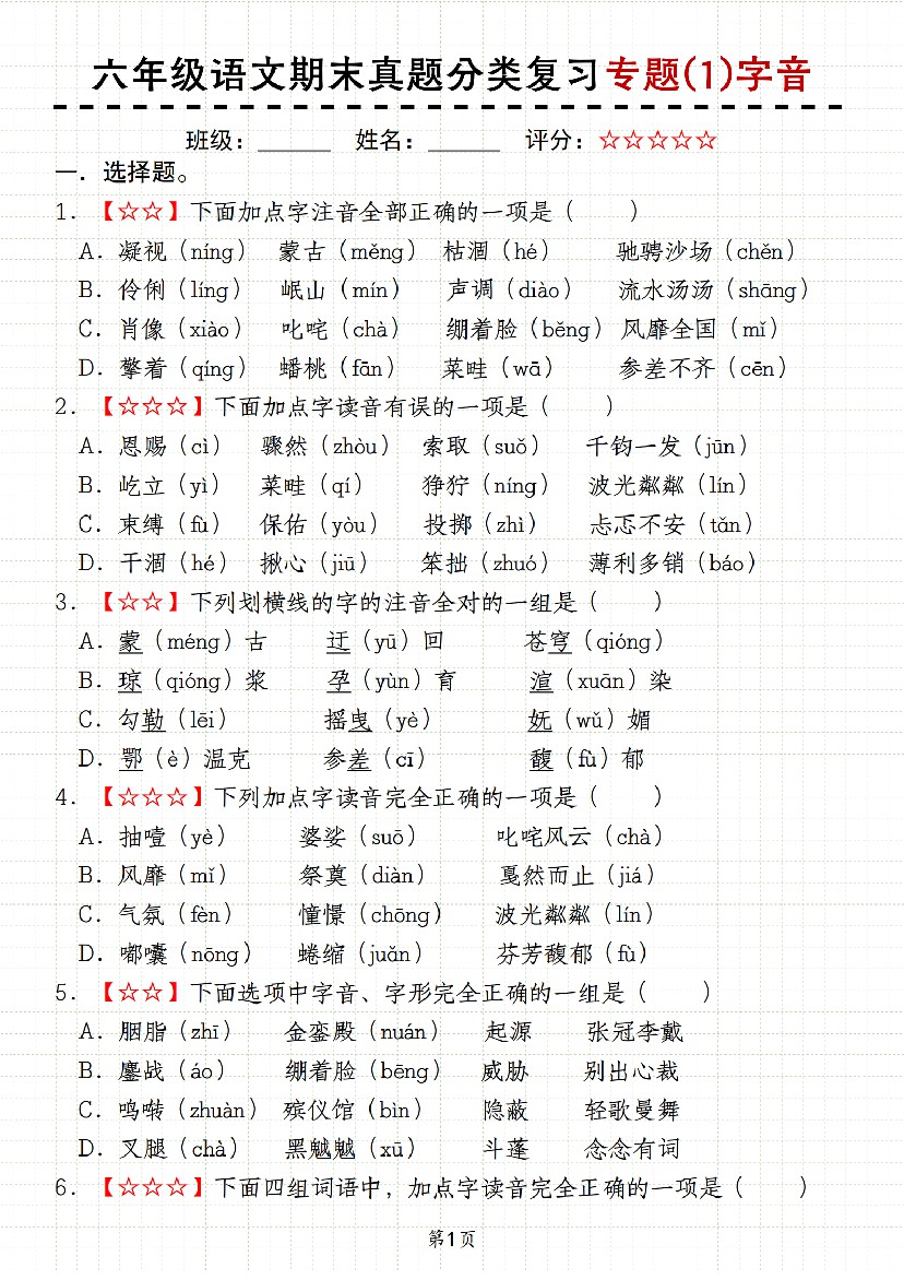 《语文期末真题分类复习专题(1)字音》6年级上册语文