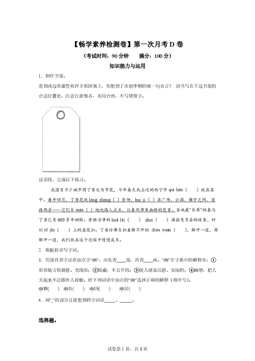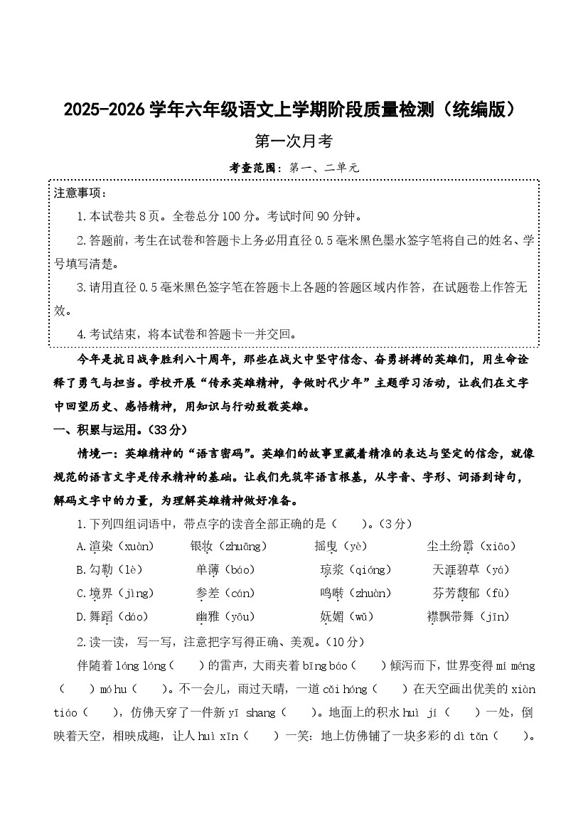 2025-2026学年统编版六年级上册第一次月考语文试卷(D卷)