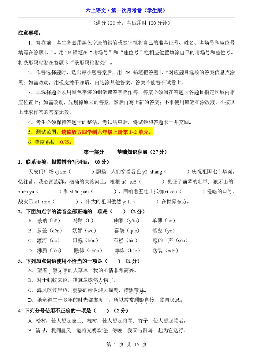 六年级(上)语文 高频考点通关密卷完整版 有解析