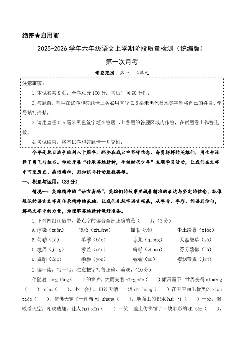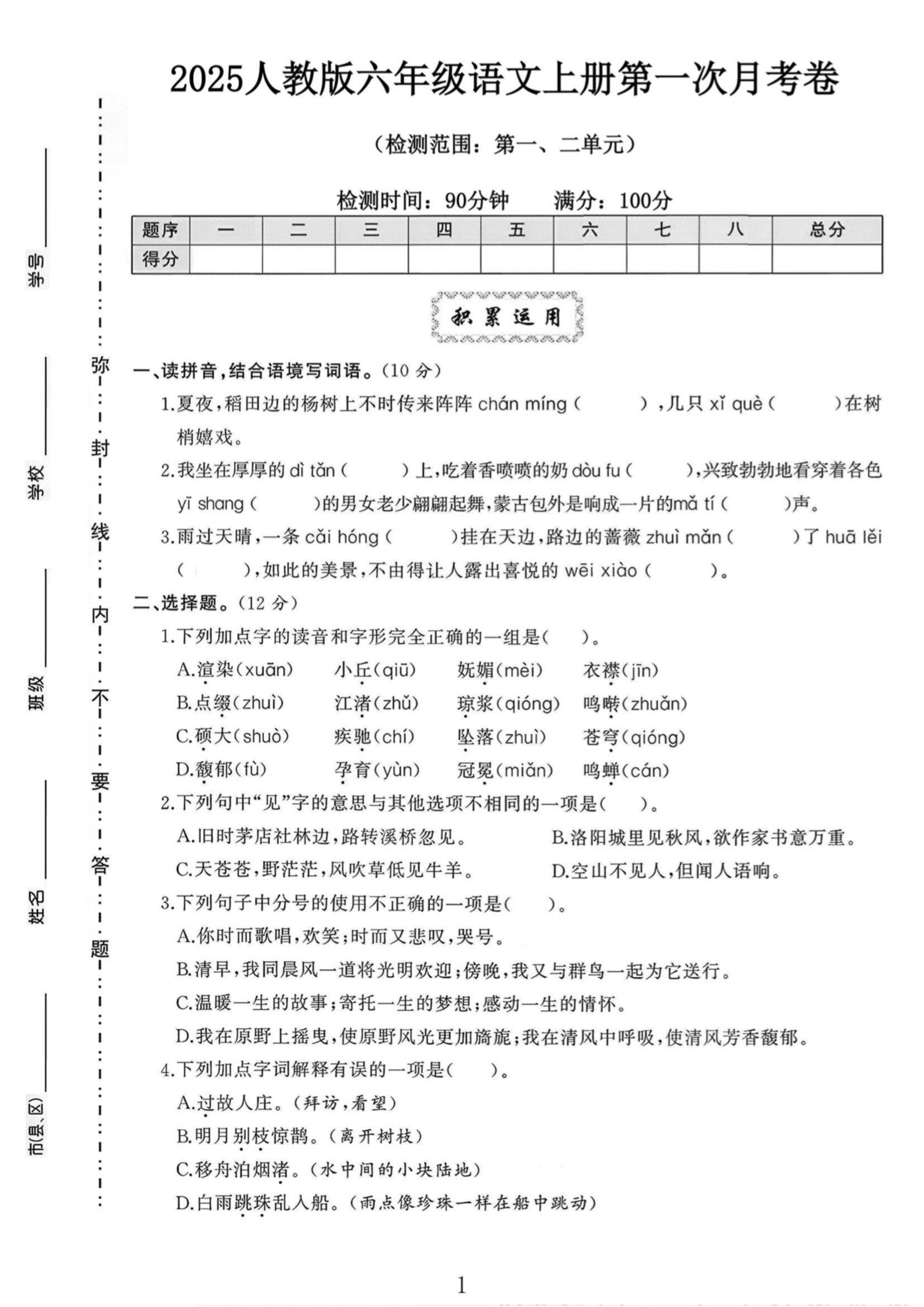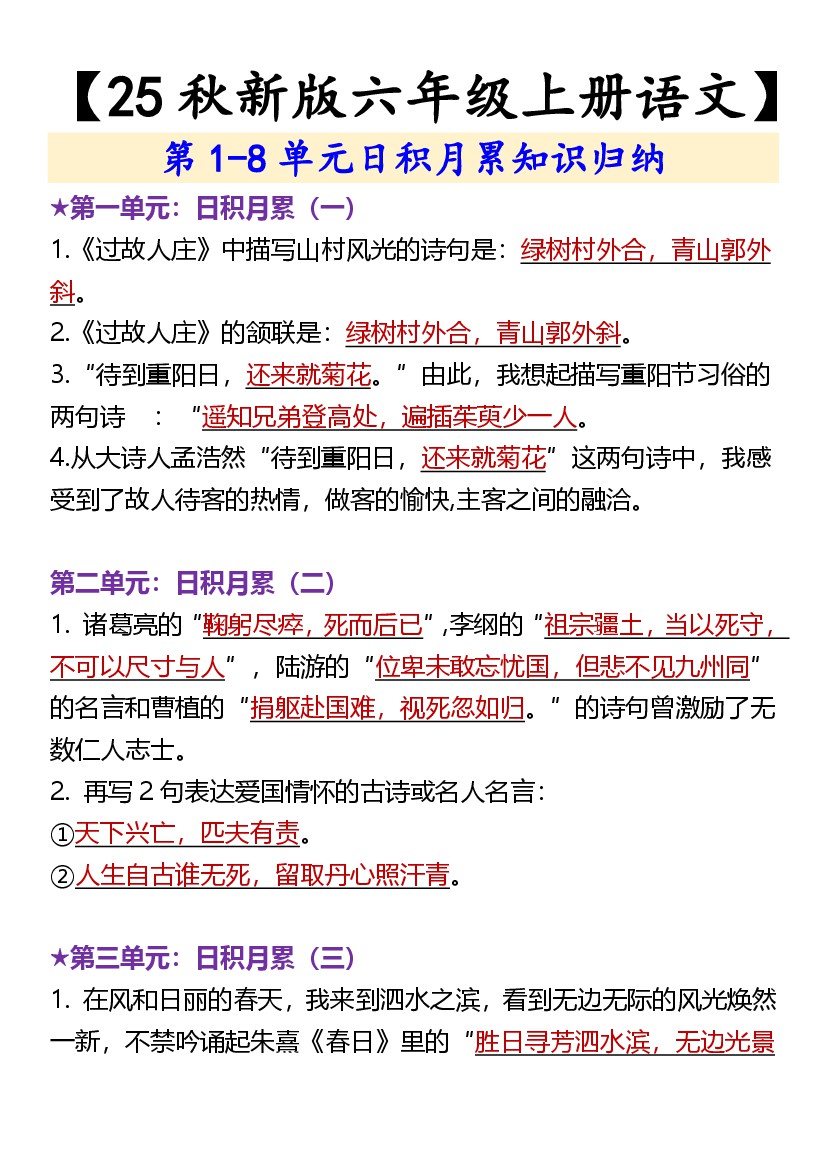 【2025秋新版】【六年级上册语文】第1-8单元日积月累知识归纳