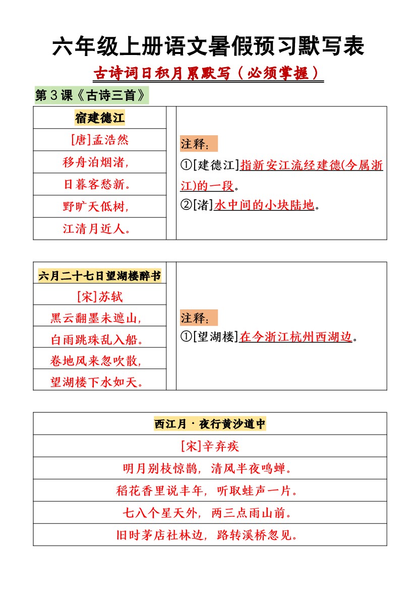 六上语文【暑假预习默写表(古诗词日积月累默写)(空白+答案)】