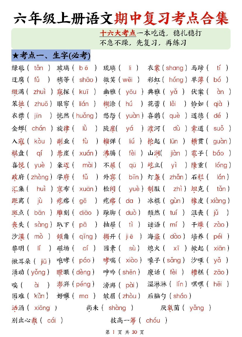 25秋全新六年级上册语文重点内容课课贴(18页)