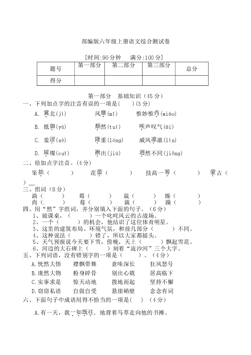 【期中必备】部编版六年级上册语文期中综合测试卷(一) (含答案)