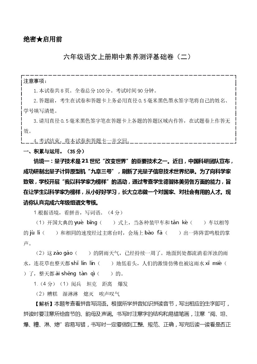 25年秋六上语文期中素养测评基础卷(二)(统编版)全解全析