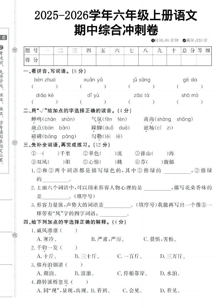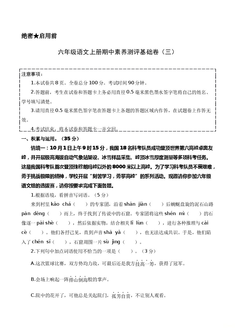 25年秋六上语文期中素养测评基础卷(三)(统编版)A4版