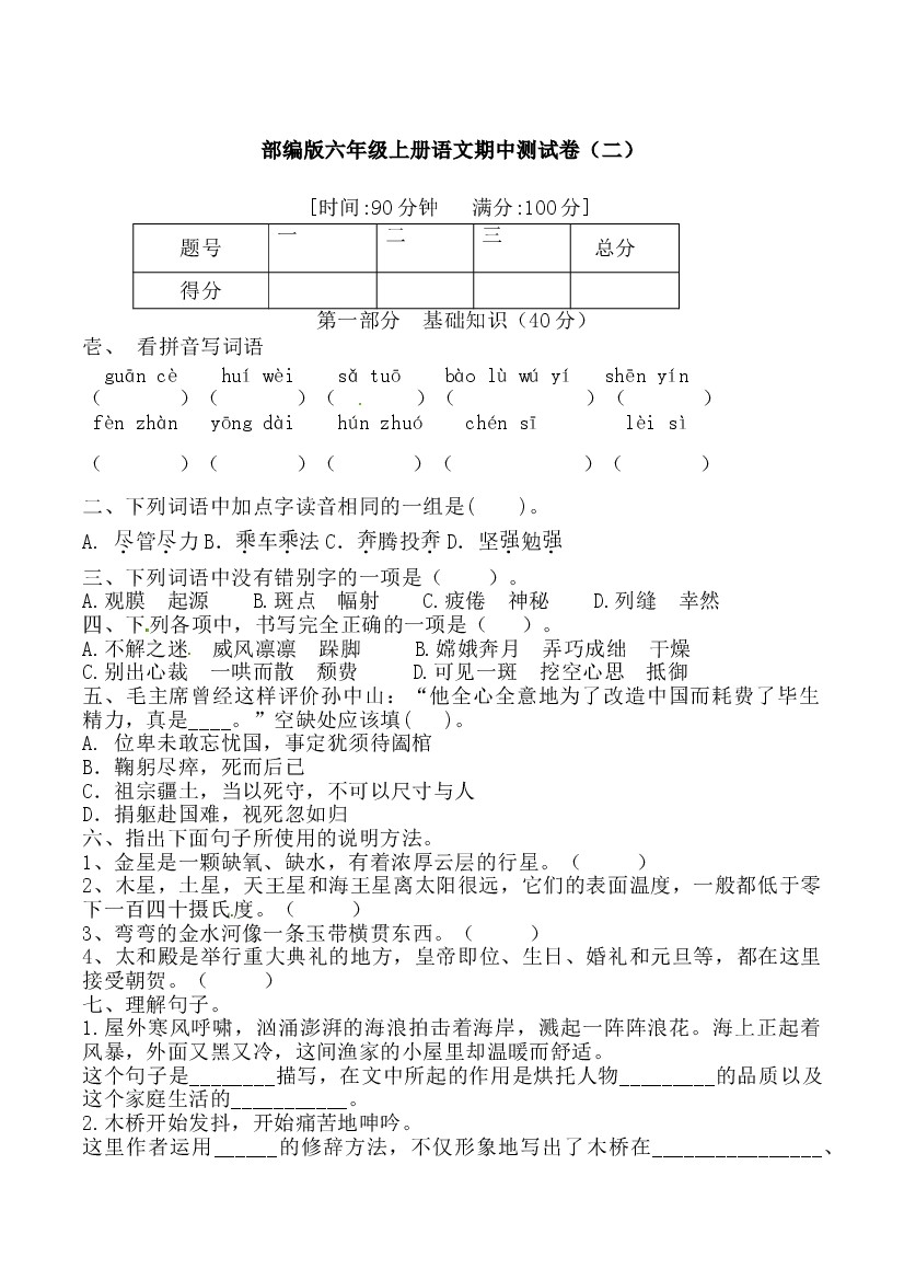 【期中必刷卷】部编版六年级语文期中综合测试卷 (含答案)