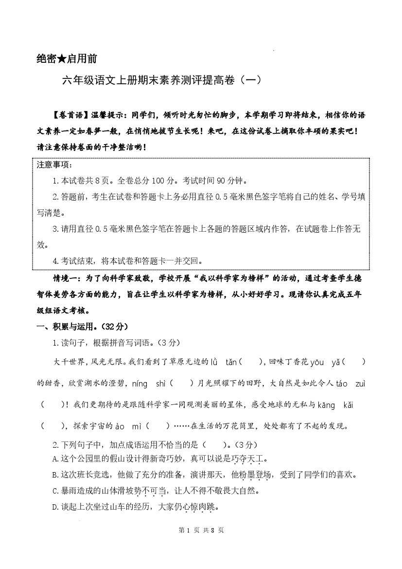 六上语文期末素养测评提高卷一(试卷+答题卡+答案解析33页)