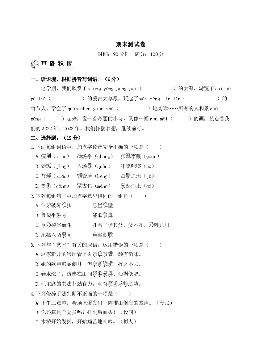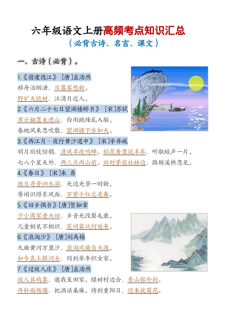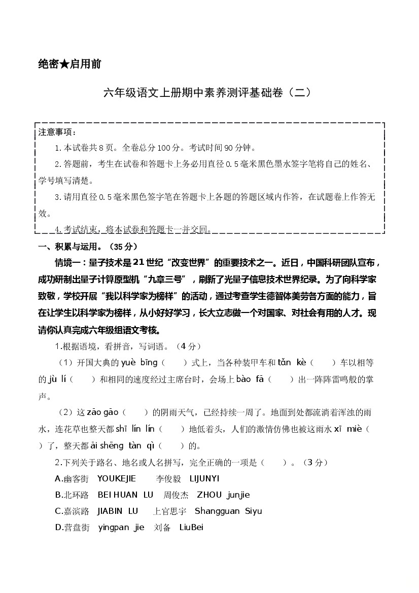 25年秋六上语文期中素养测评基础卷(二)(统编版)A4版