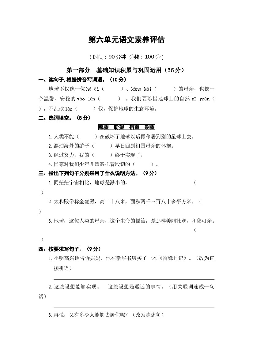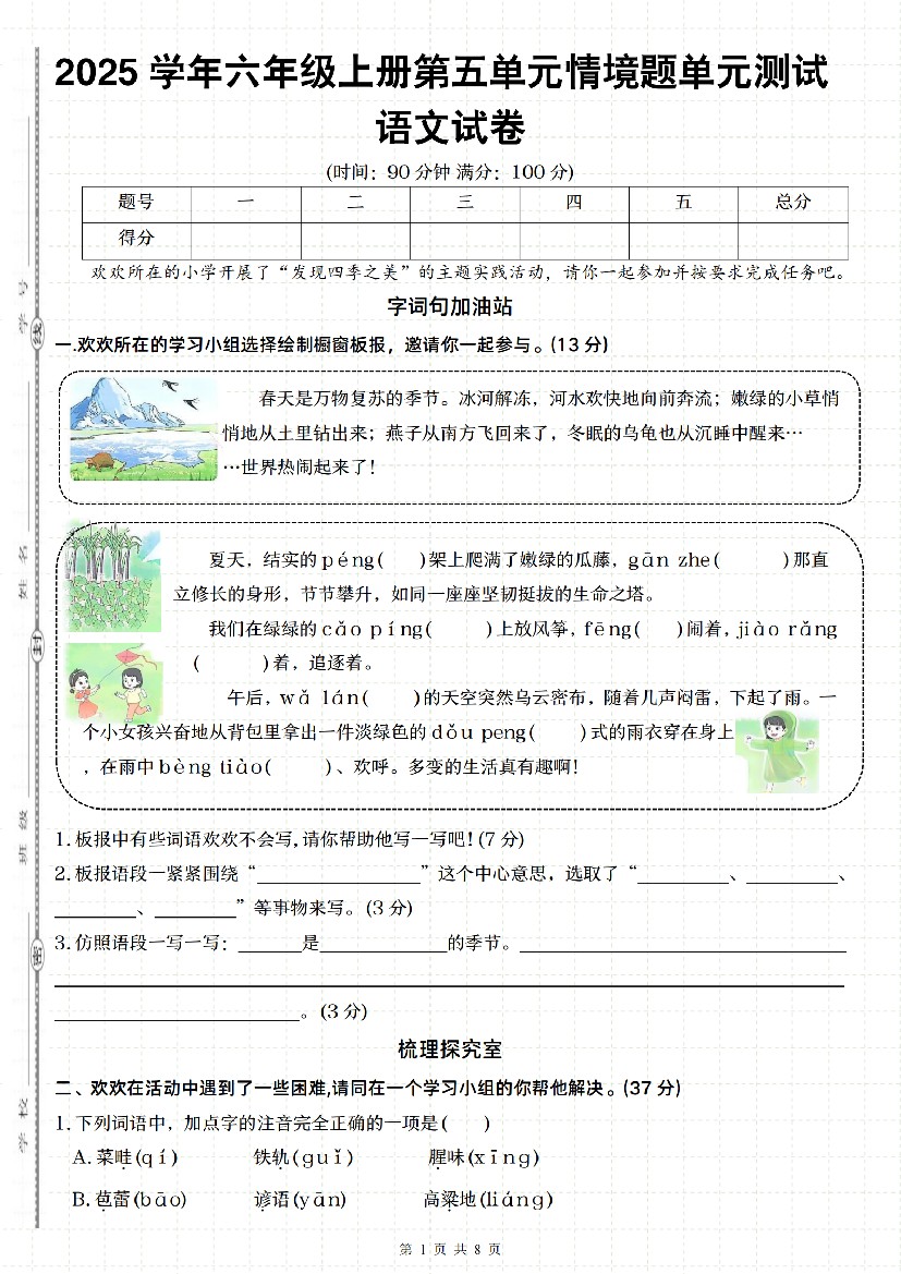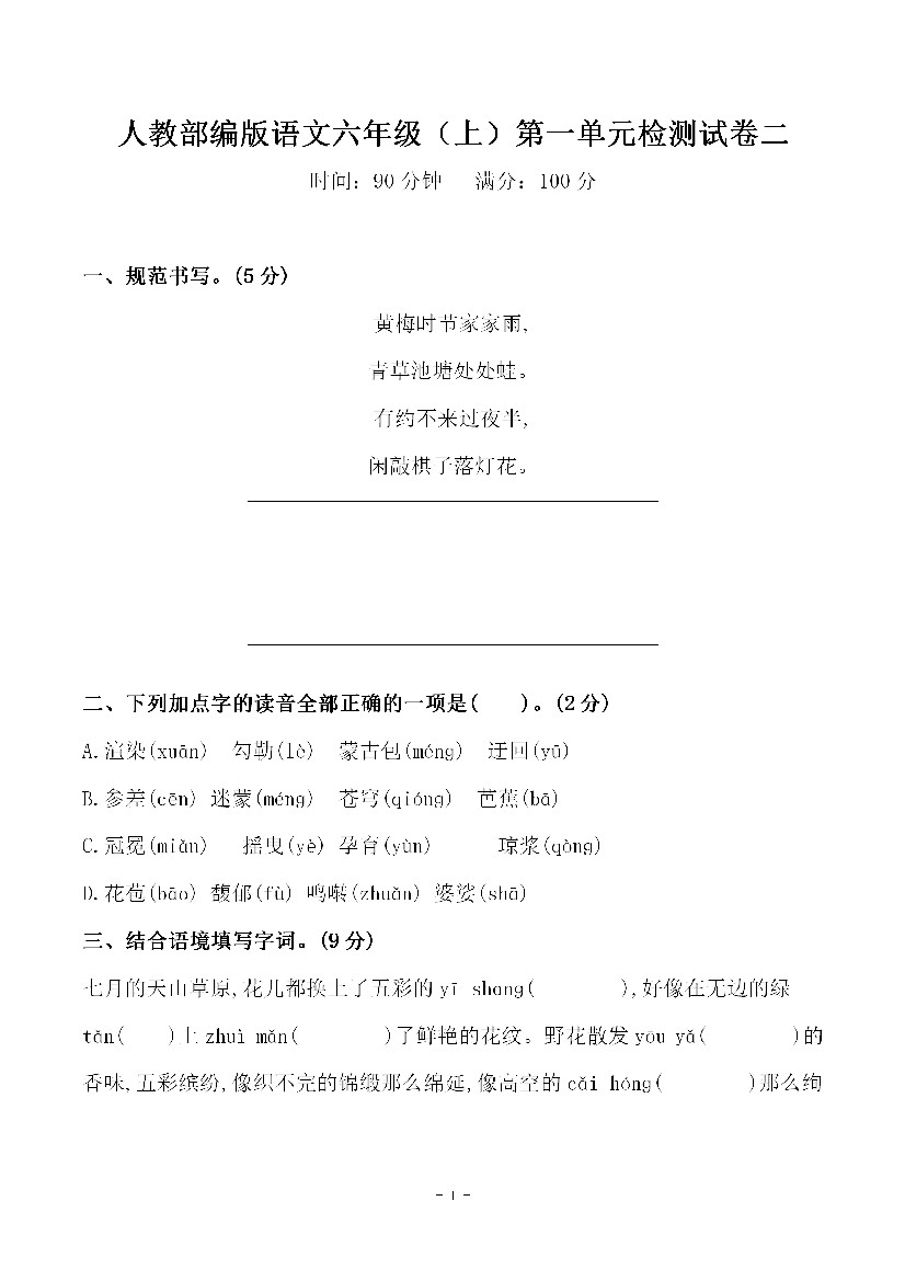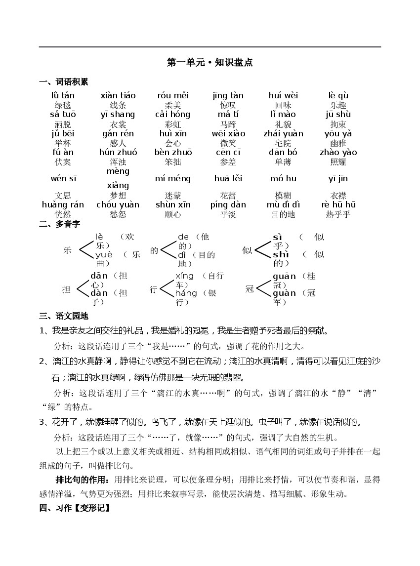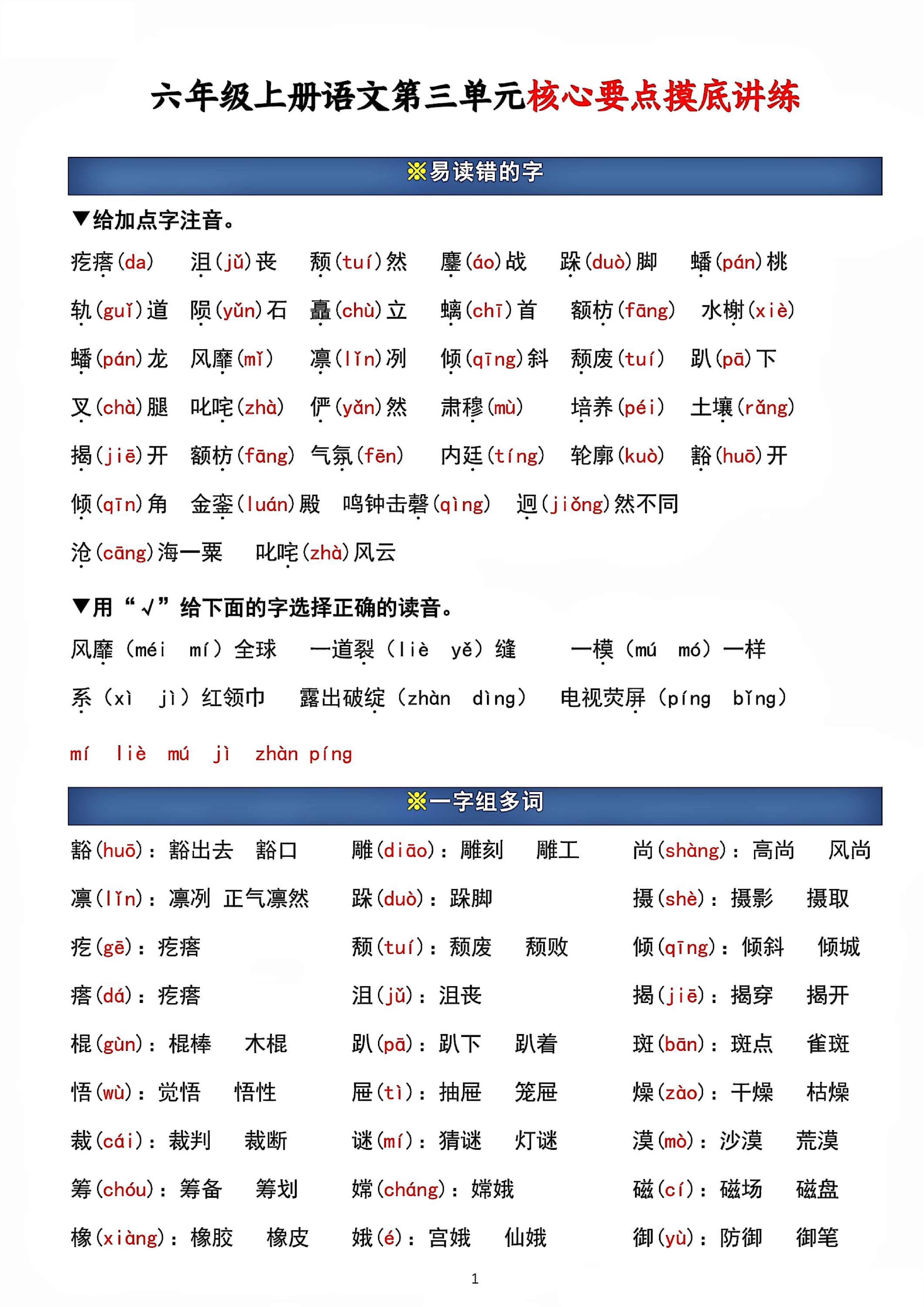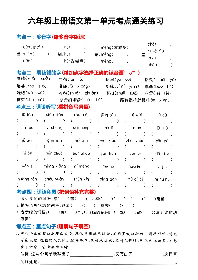 第一单元(知识盘点+单元测试)—部编版六年级上册(含答案)