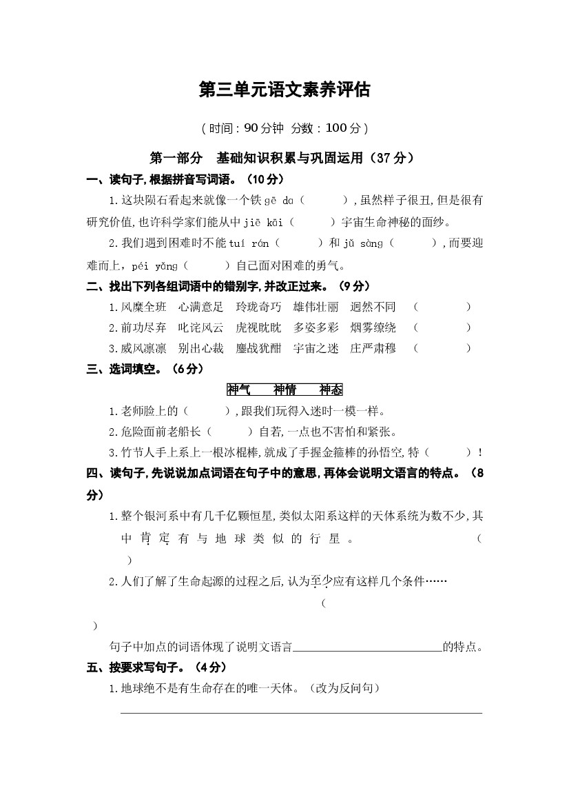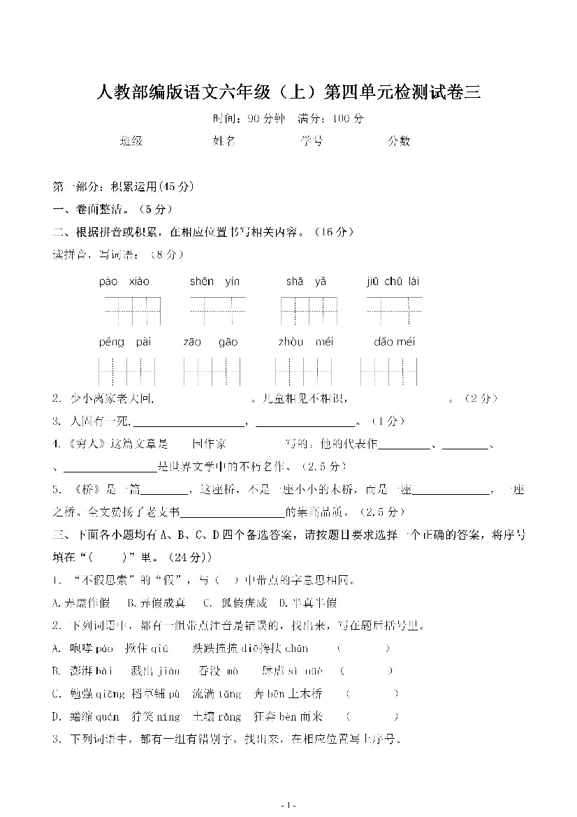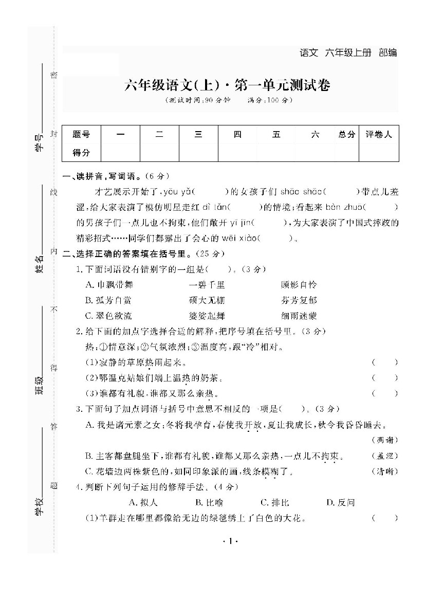 六年级上册 语文第三单元提升冲关测试卷部编版(含答案)
