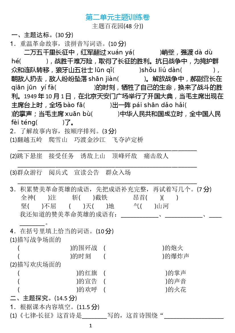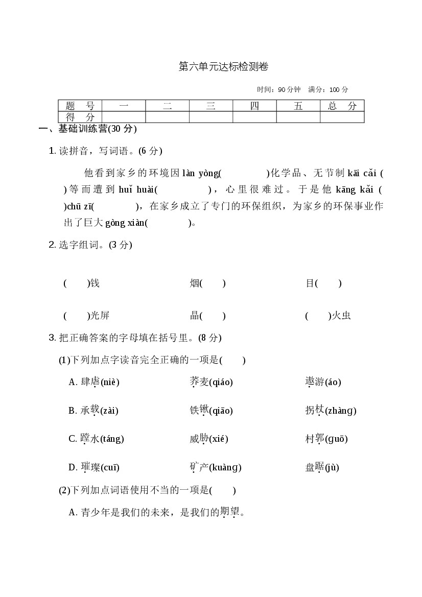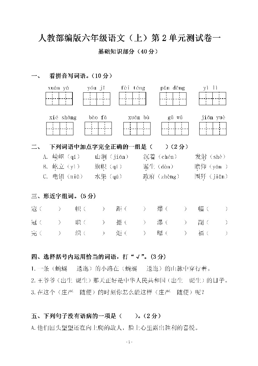 《2025学年六年级上册第五单元情境题单元测试语文试卷》统编版_