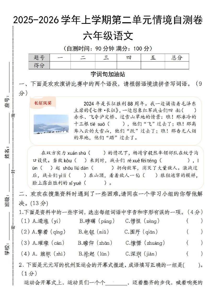 《2025-2026学年上学期第二单元情境自测卷六年级语文》