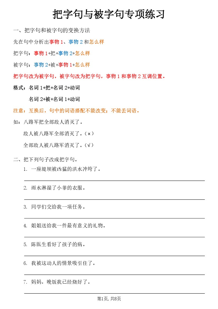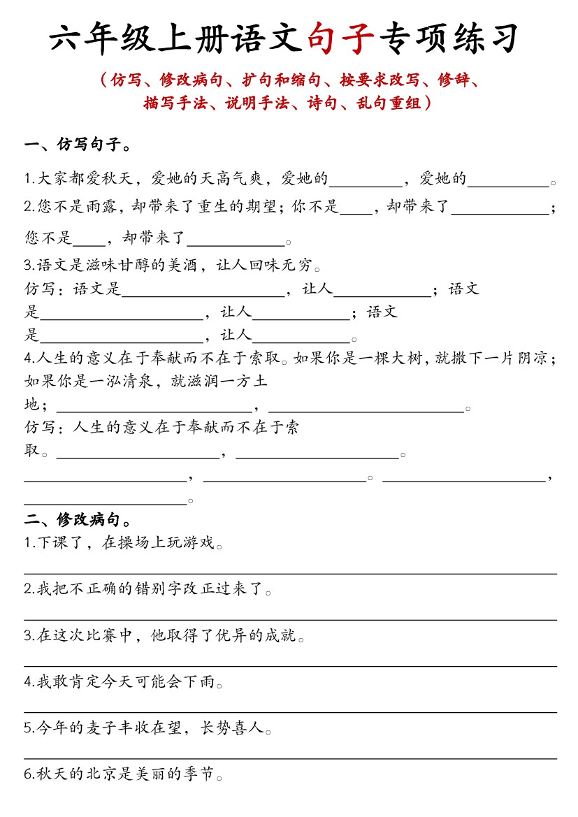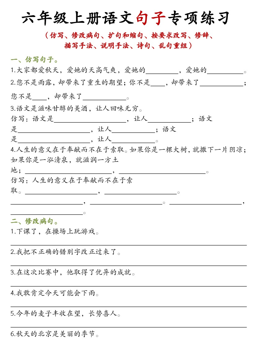 六年级(上)语文 句子专项练习(仿写,病句,改写)