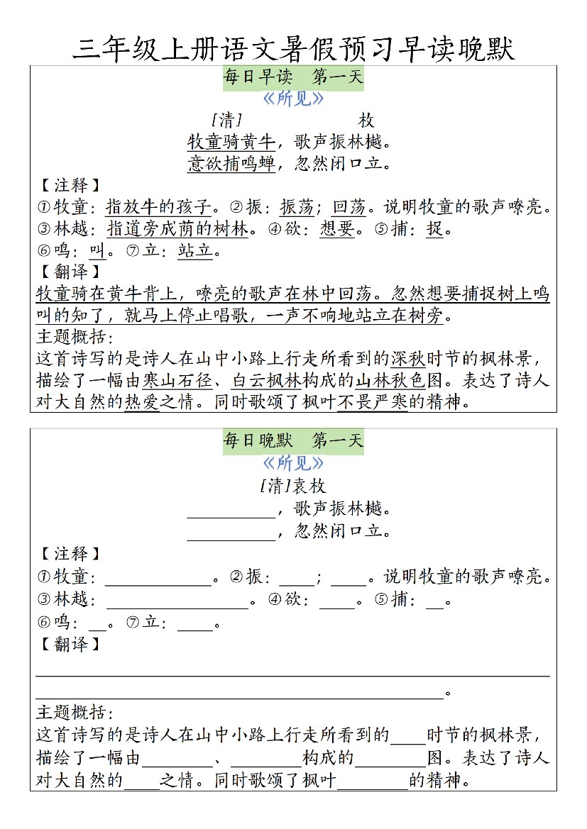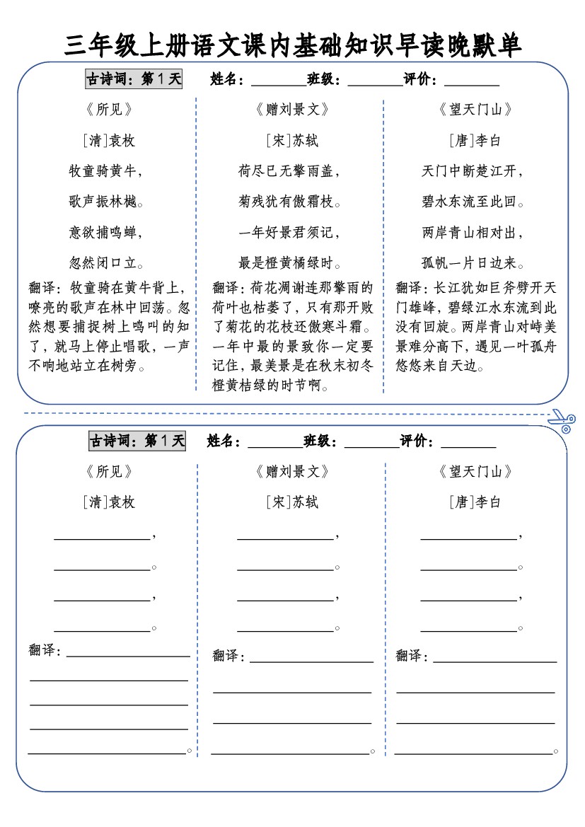 三上语文【25秋1-26课必背知识晨读单(35页)】