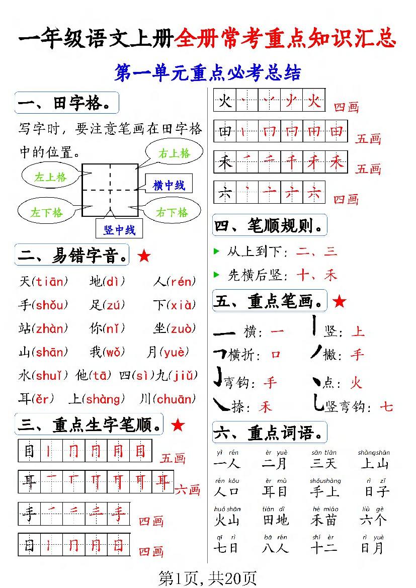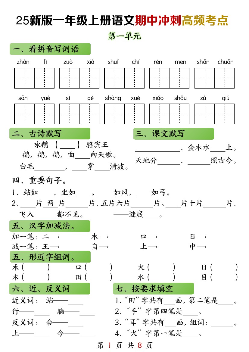 【25学年一上语文1-8单元考点总结(8个必背知识点)空白+答案版32页