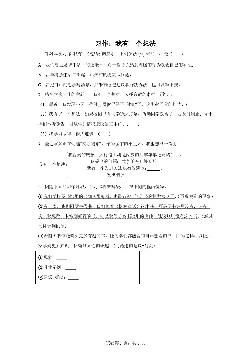 25秋【三上语文】单元写作能力提升-第七单元习作:我有一个想法(范文点评)-(统编版)