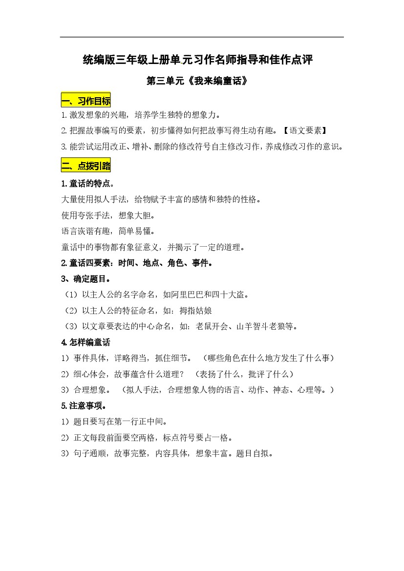 人教部编版三年级语文上册第3单元同步作文:我来编童话-写作指导+范文赏析+病文升格-部编版语文三年级上册
