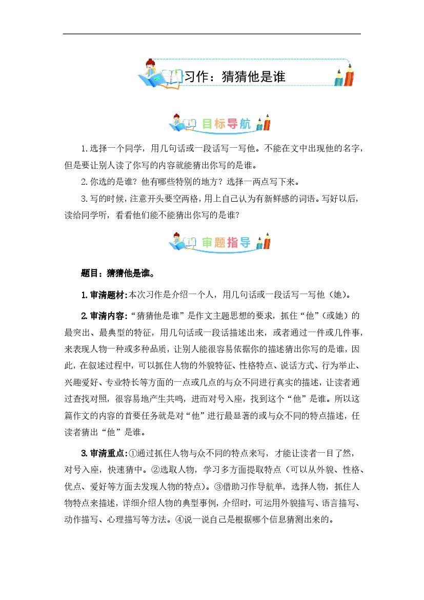 人教部编版三年级语文上册第1单元同步作文:猜猜他是谁-写作指导+范文赏析+病文升格-部编版语文三年级上册
