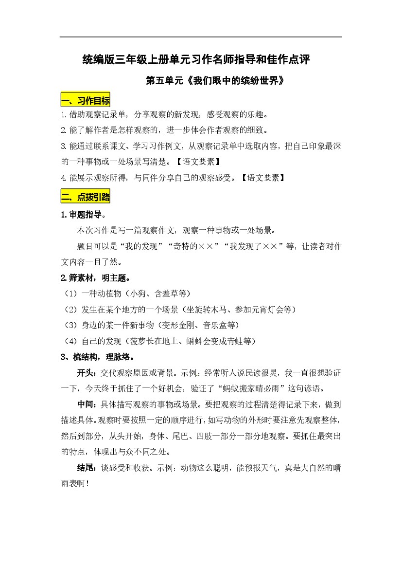人教部编版三年级语文上册第5单元《我们眼中的缤纷世界》习作名师指导和佳作点评(10篇)