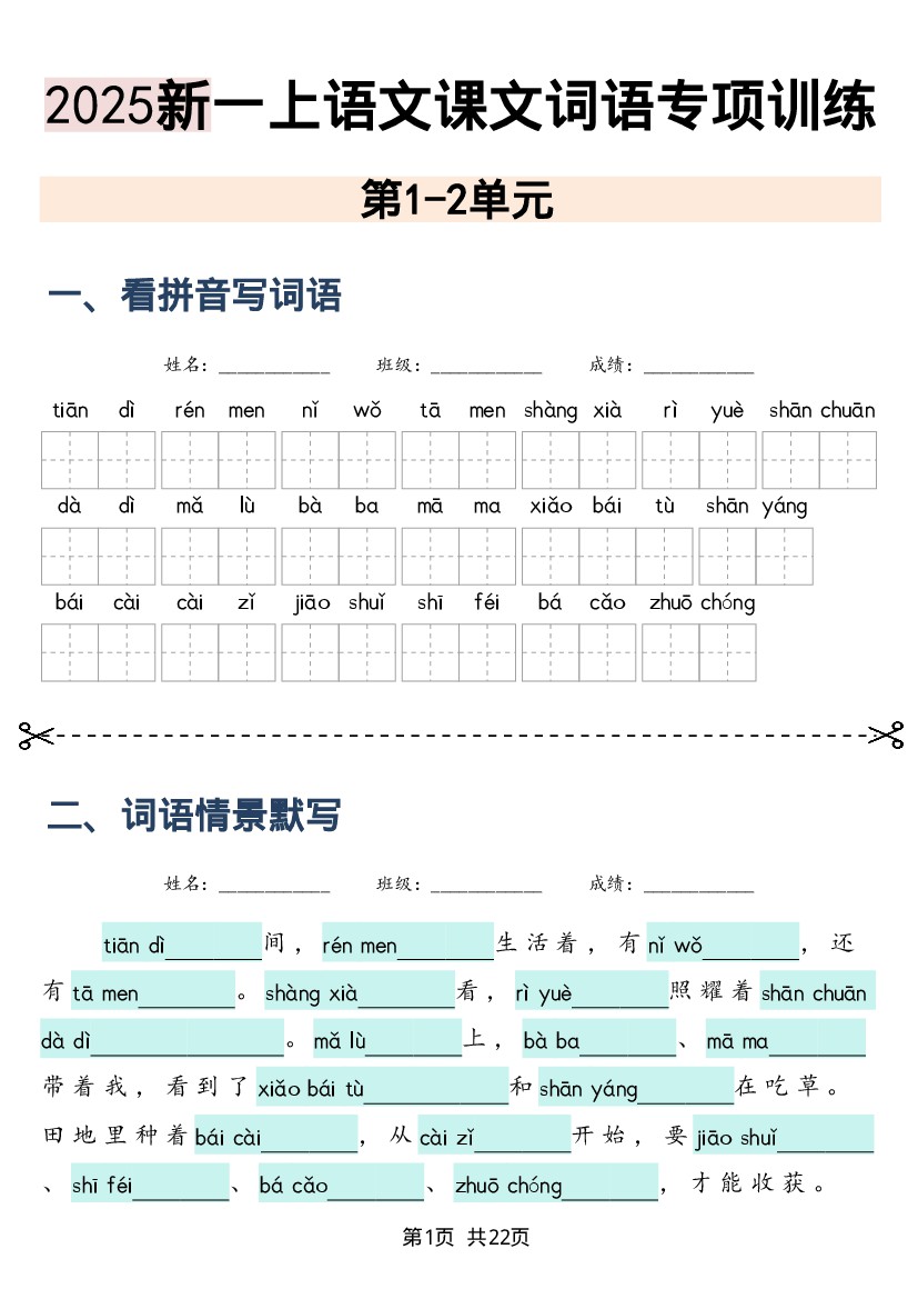 【25秋一上语文看拼音写词语(含答案16页)