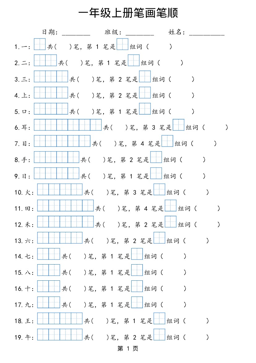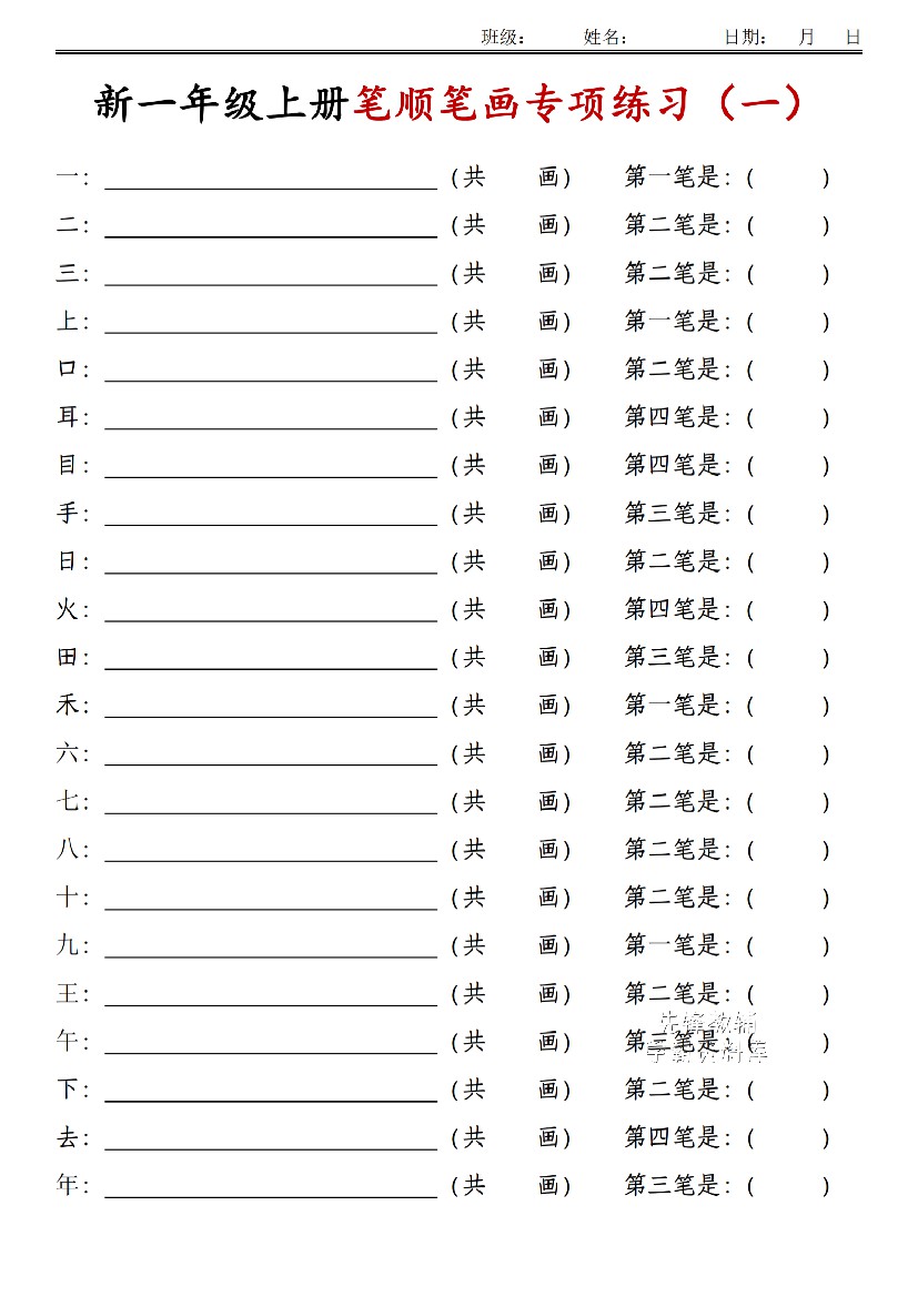 题目一年级上笔画笔顺