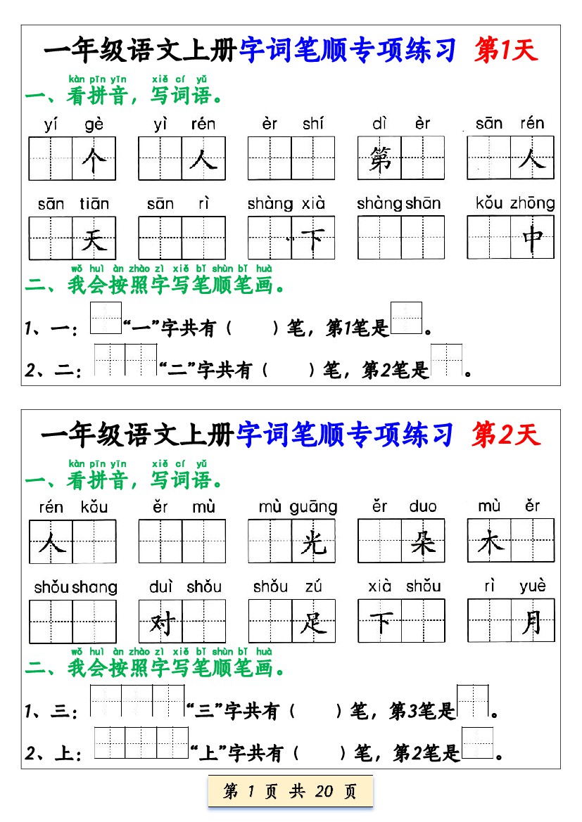 一上语文【字词笔顺专项小纸条40天】