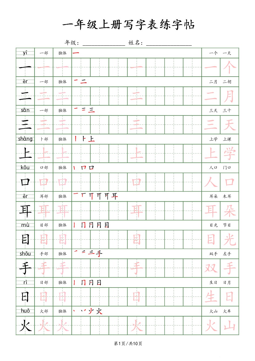 一上写字表 字帖描红