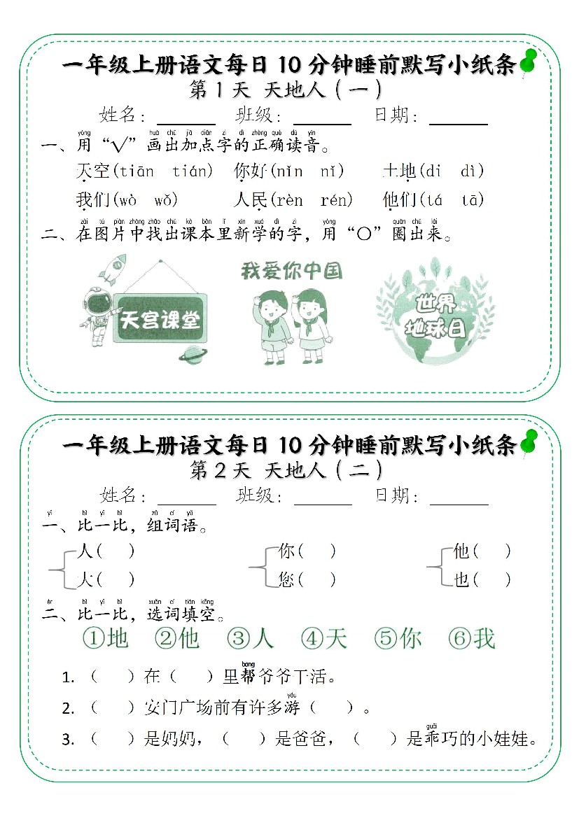 一年级(上)语文 每日10分钟睡前默写小纸条1