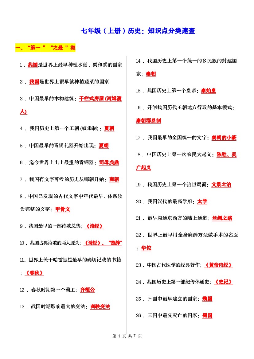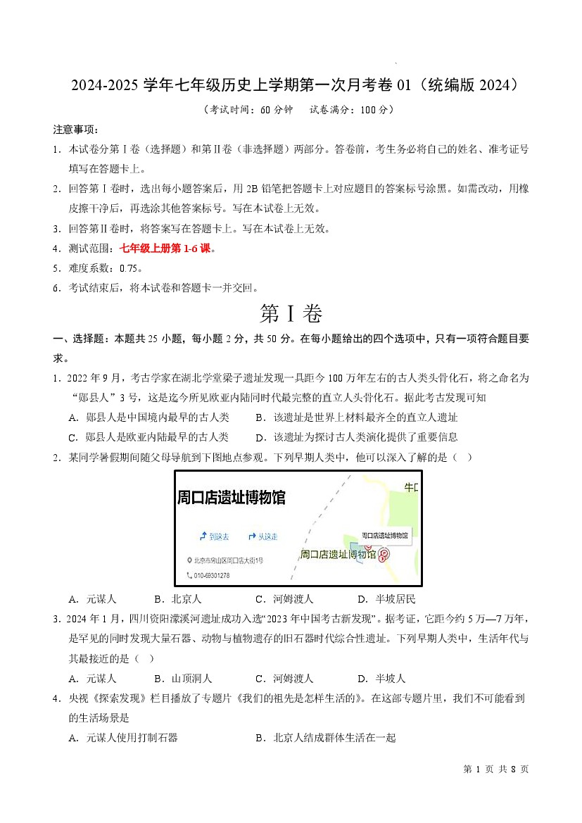 【25七上】历史第一次月考卷【测试范围:第1-6课】