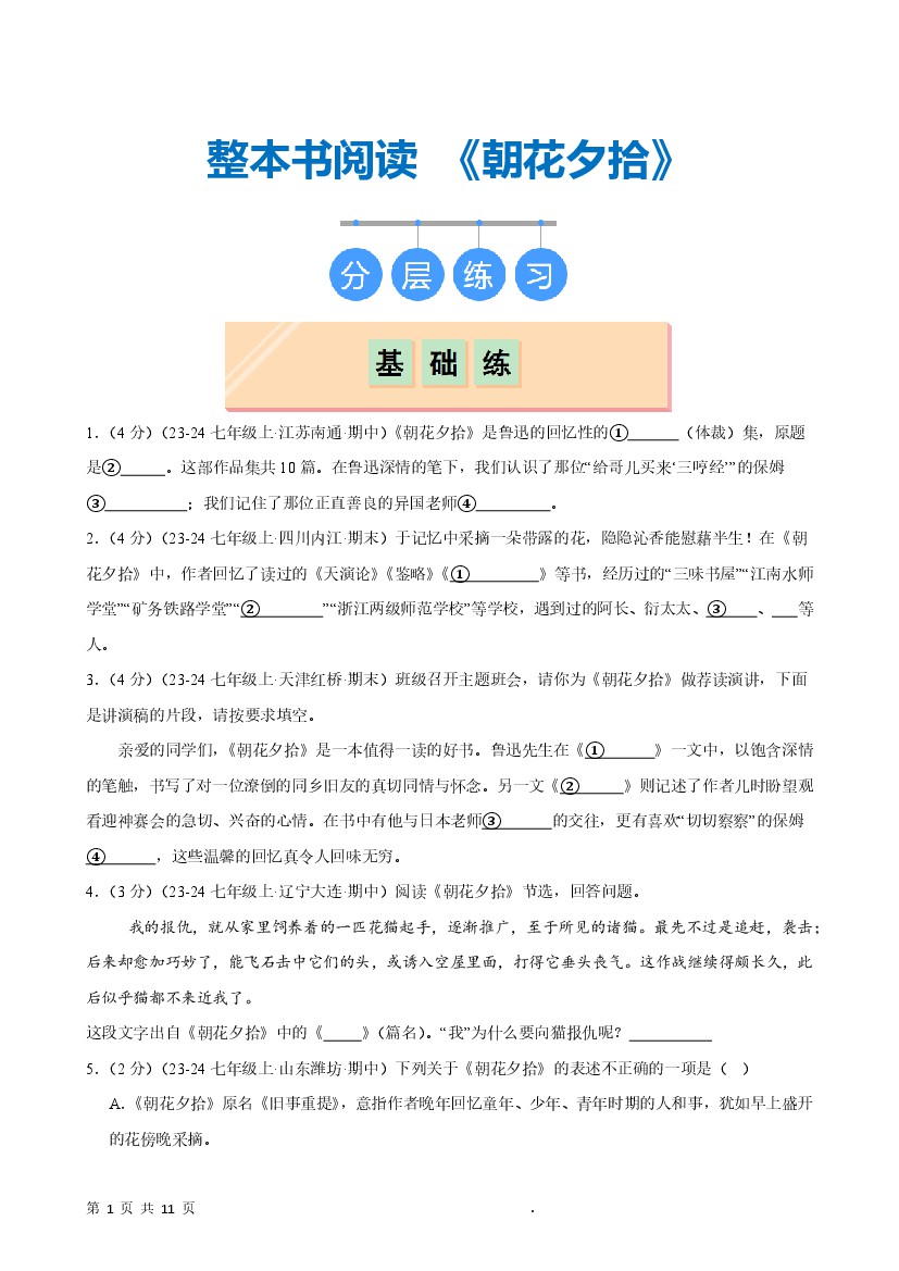 七年级(上)语文必读名著《朝花夕拾》整本书阅读分层作业