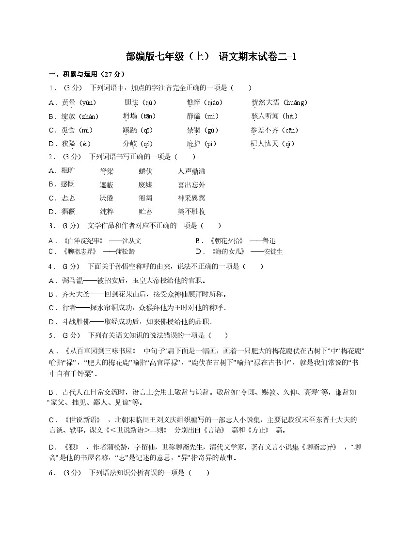 七年级上册期中重难点复习攻略——名著阅读重难点