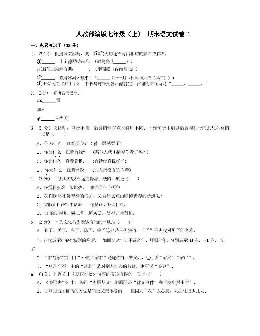 【七年级上册语文】第一单元 名著专项一 《朝花夕拾》第一至五篇