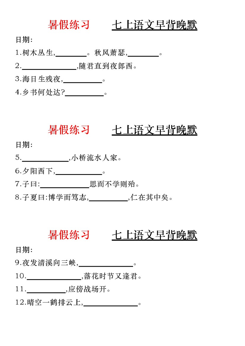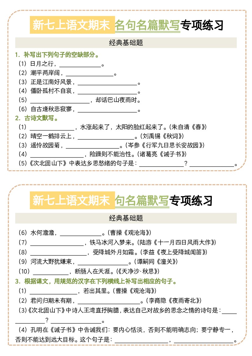 七上语文期末复习名句名篇默写专项小纸条(空白+答案)