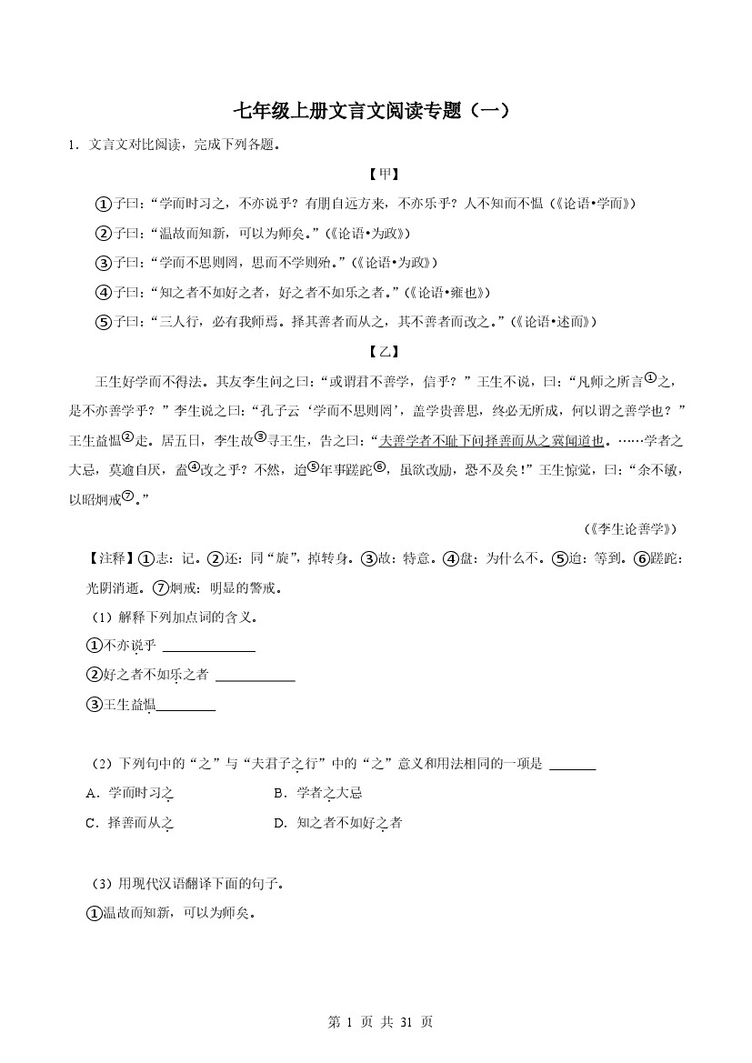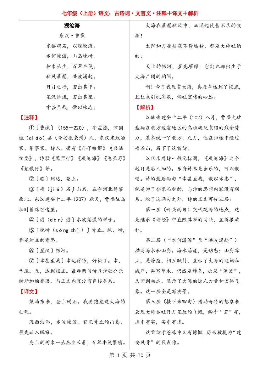 七上语文全册【古诗词&文言文】注释+译文+解析