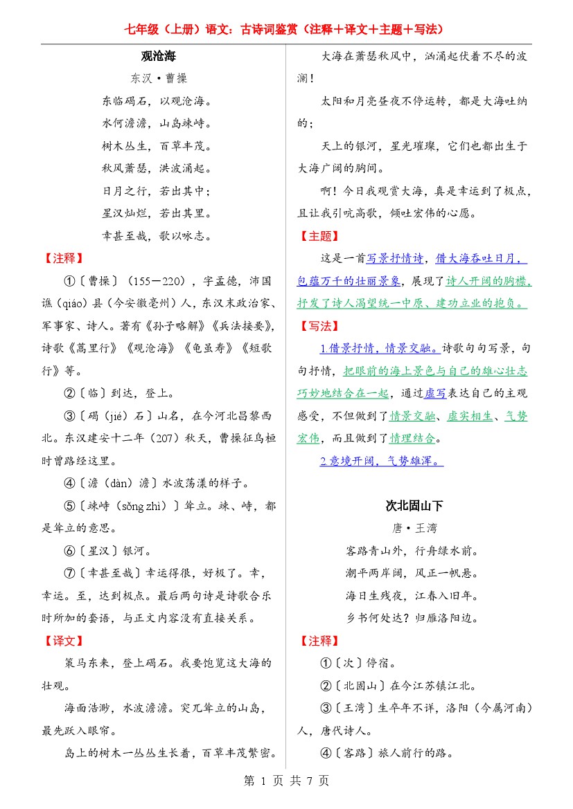 七上语文全册【古诗词鉴赏】(注释+译文+主题+写法)