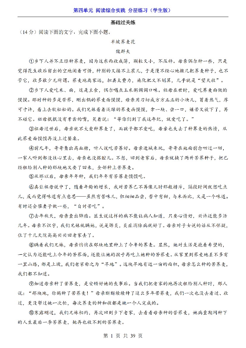 七年级(上)语文第四单元 阅读综合实践 分层练习