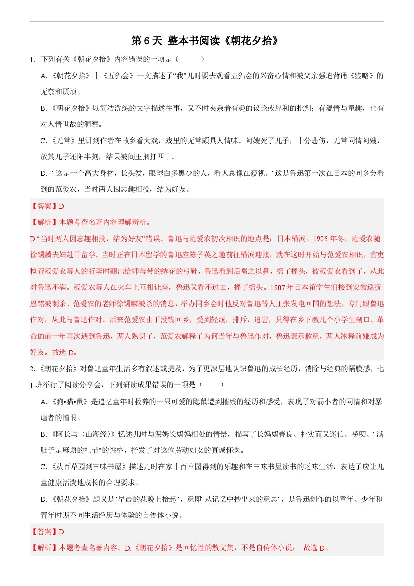 【七上语文】06 整本书阅读《朝花夕拾》--2025国庆7天练(解析版)