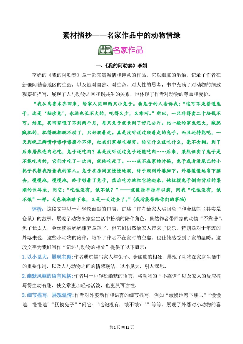 【作文】七年级上册语文专题05:素材摘抄——名家作品中的动物情缘(名家作品素材阅读+单元专题解析)