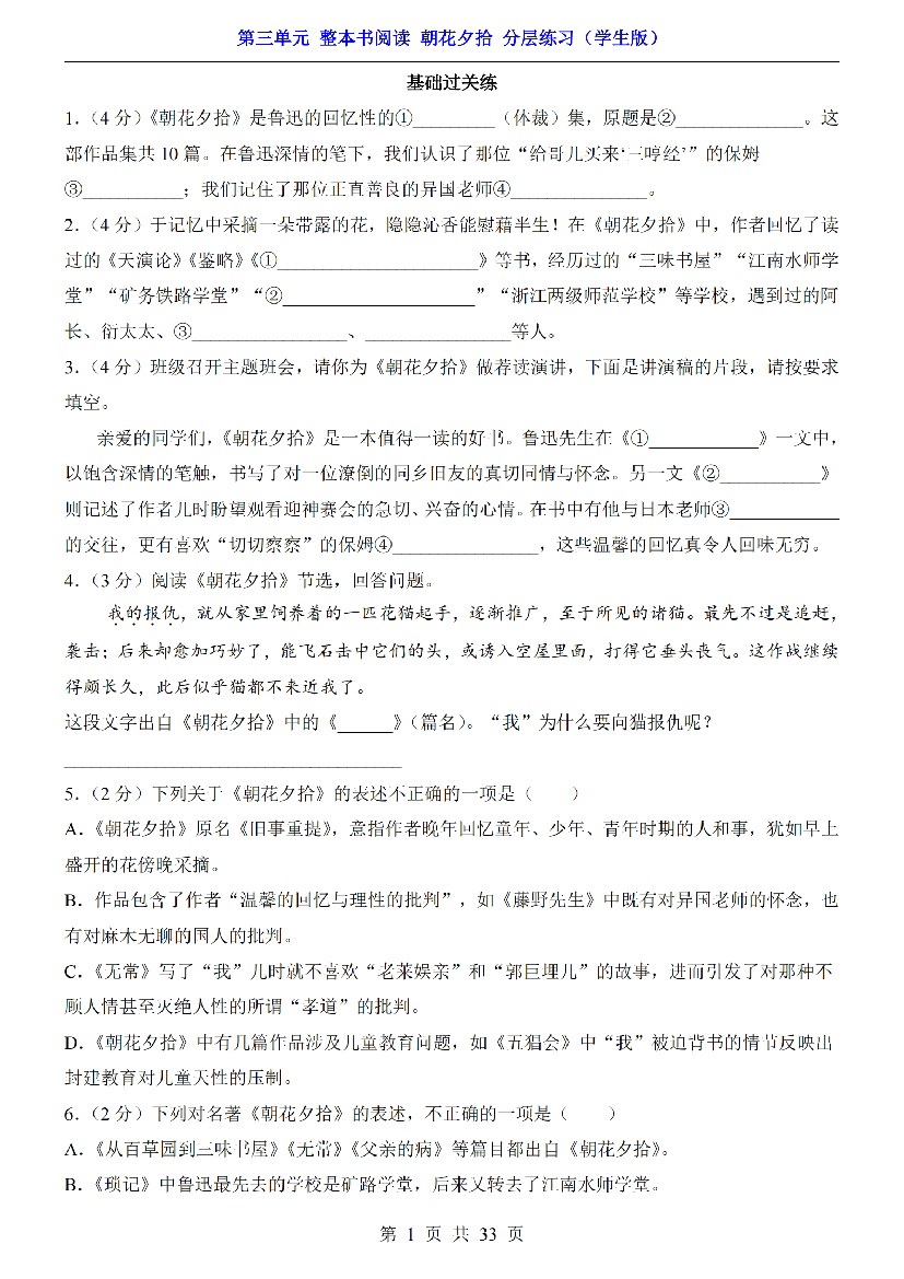 七年级(上)语文第三单元 整本书阅读 朝花夕拾 分层练习