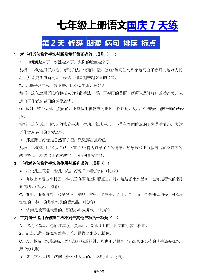 【七上语文】02修辞朗读病句排序标点--2025国庆7天练(原卷版)