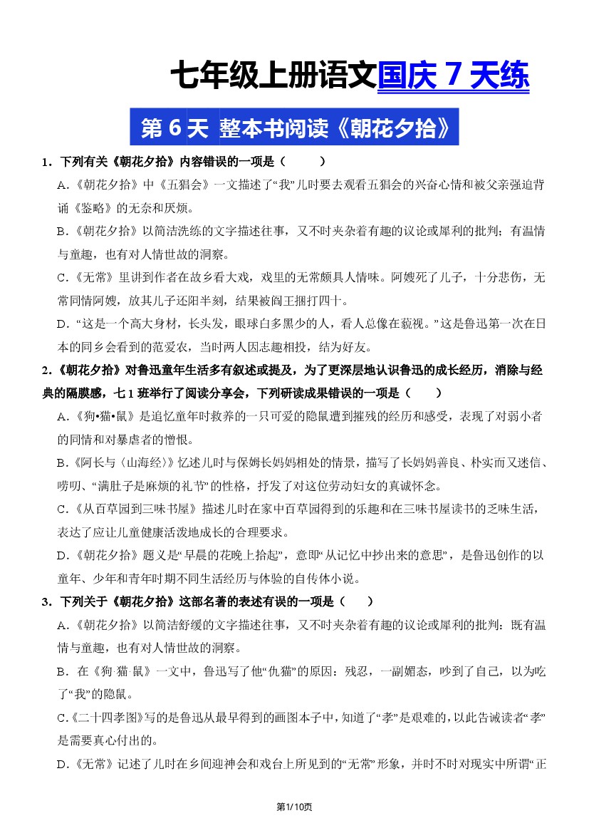 【七上语文】06 整本书阅读《朝花夕拾》--2025国庆7天练(原卷版)