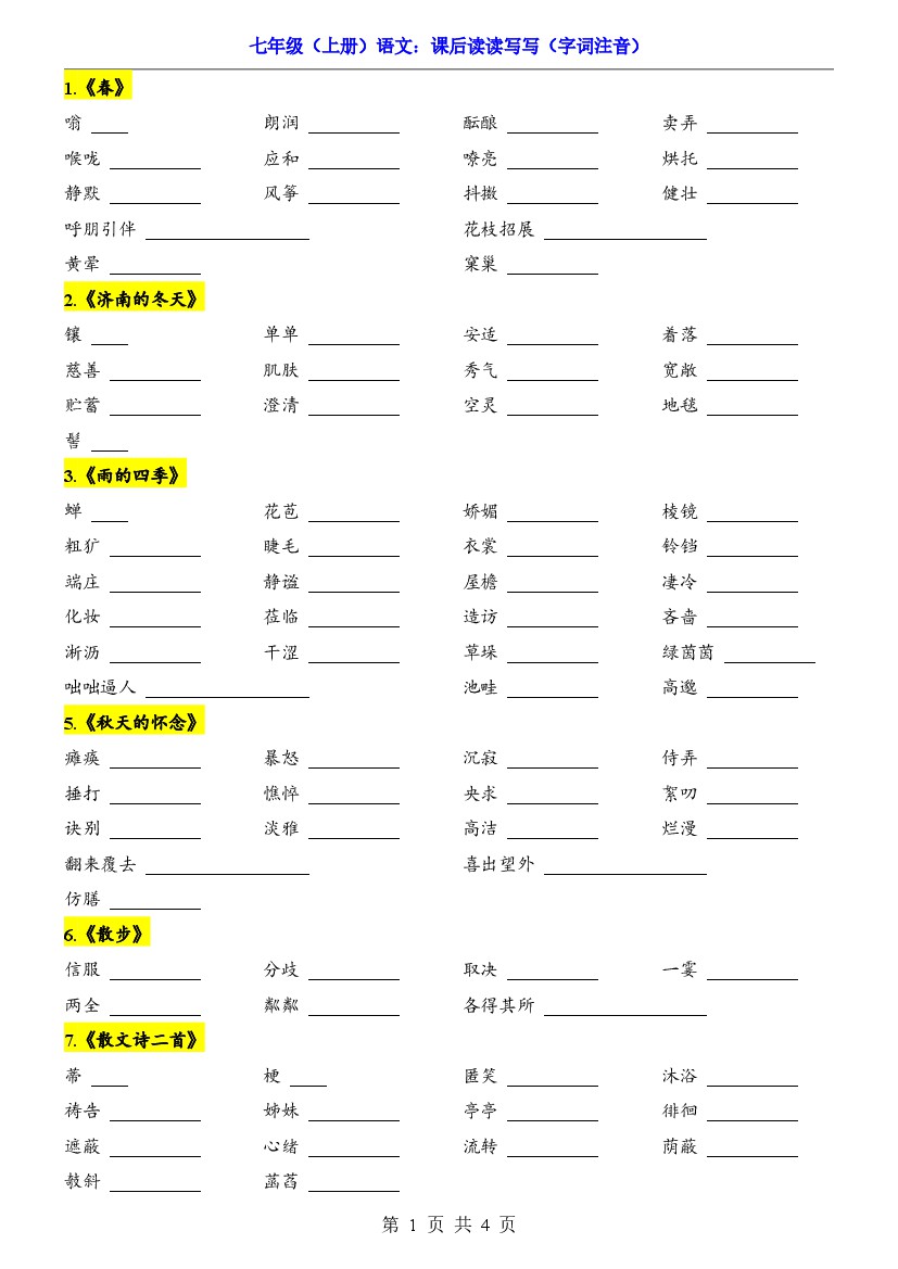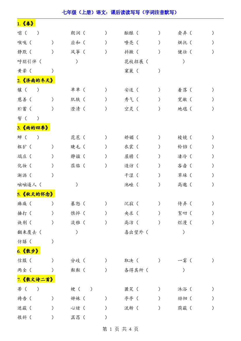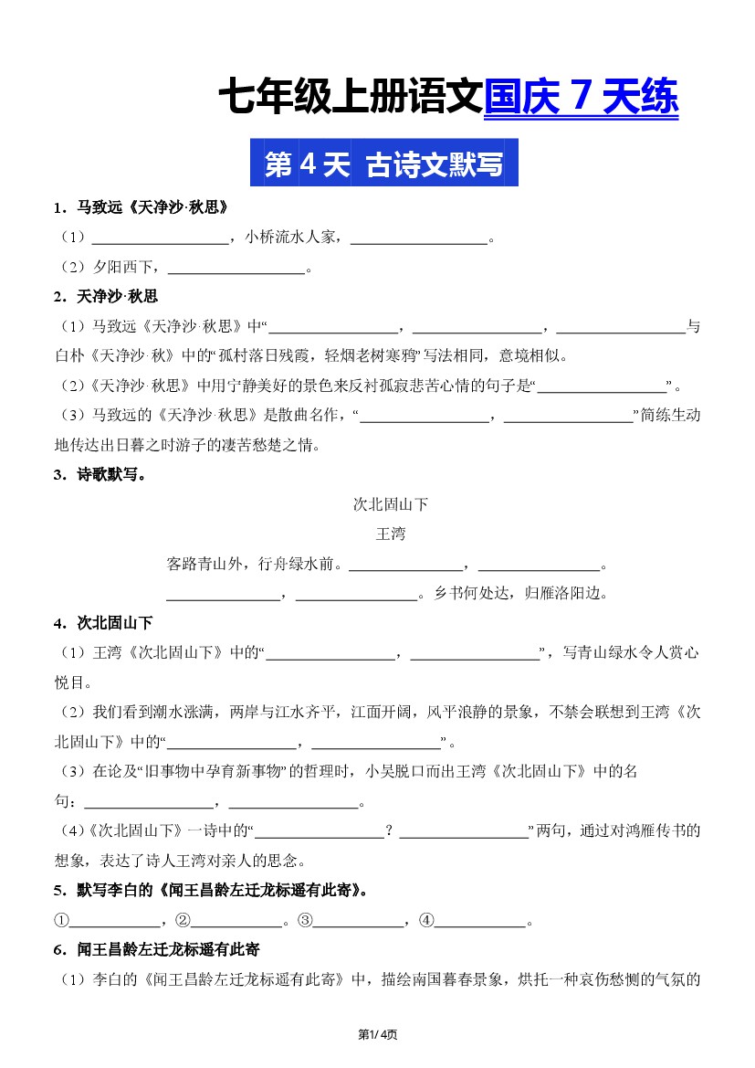 【七上语文】04古诗默写--2025国庆7天练(原卷版)