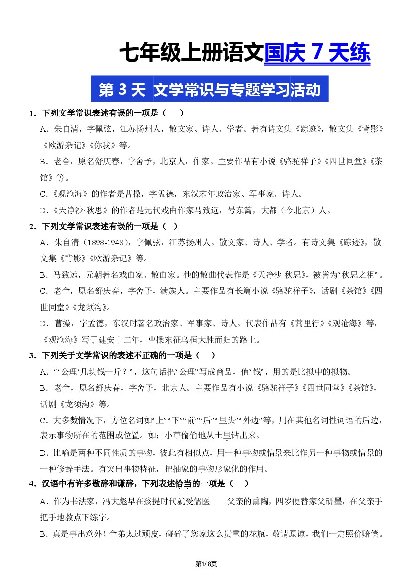 【七上语文】03文学常识与专题学习活动--2025国庆7天练(原卷版)