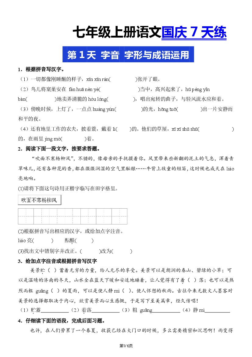 【七上语文】01字音字形与成语运用--2025国庆7天练(原卷版)